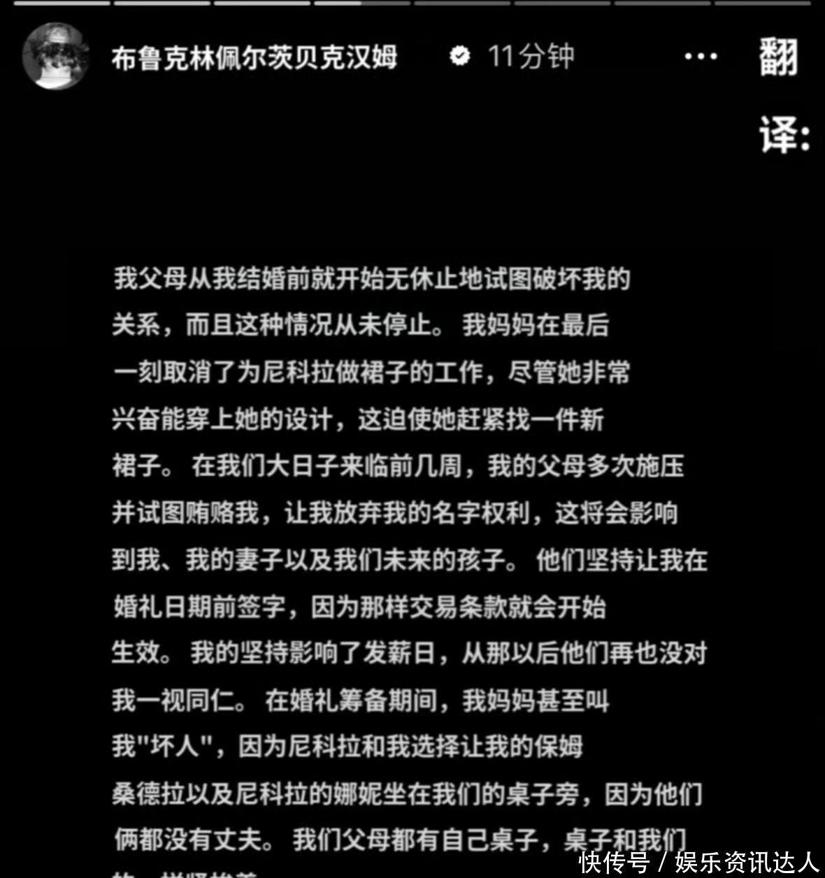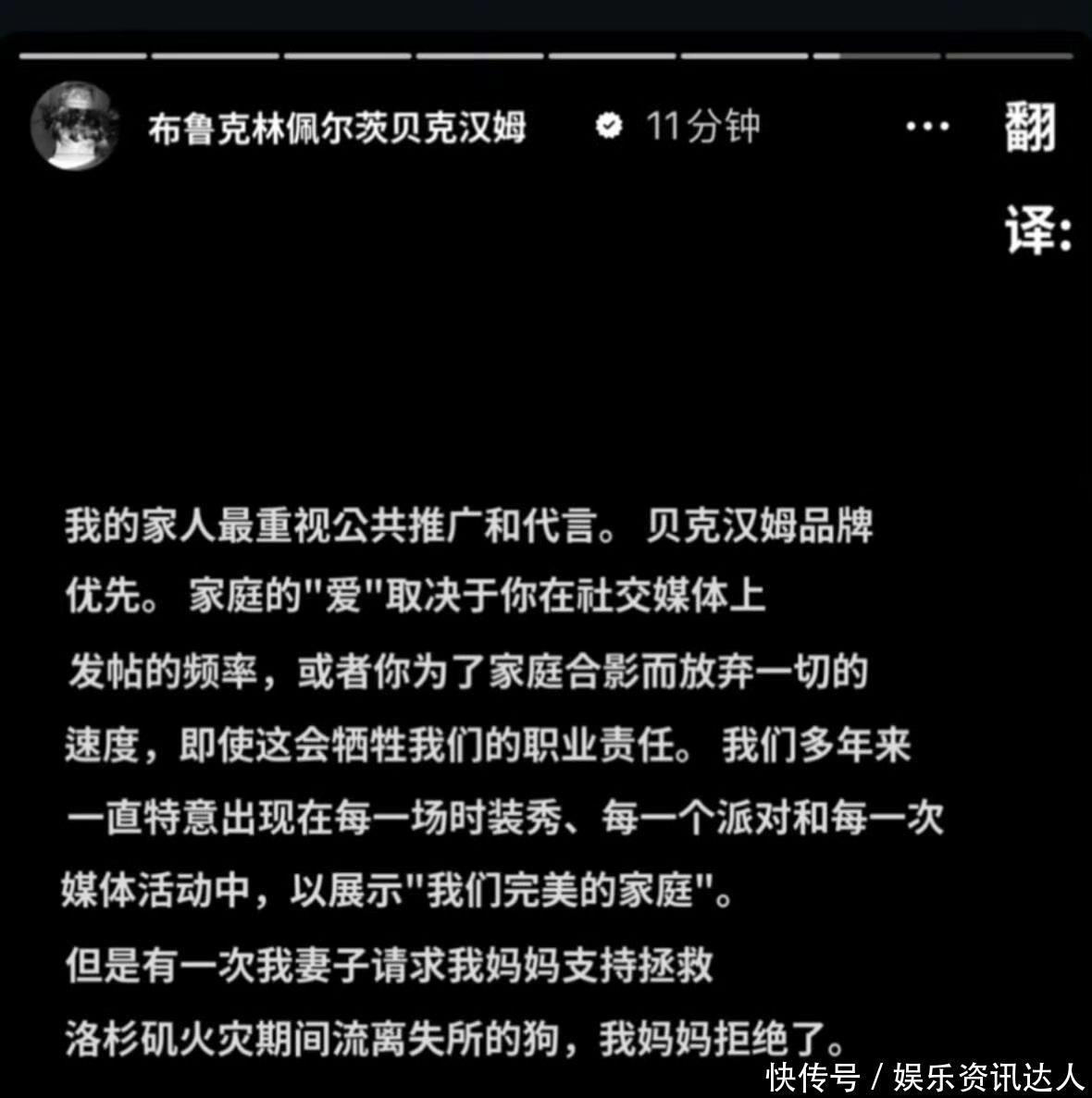 谁都没想到,贝克汉姆这样的国际巨星也会因为婆媳矛盾闹到跟儿子决裂的地步! 1月20日,贝克汉姆大儿子布鲁克林在社交媒体上发布6000字长文控诉父母,细数贝克汉姆夫妇的多项“罪状”,引发了全网网友的热议。