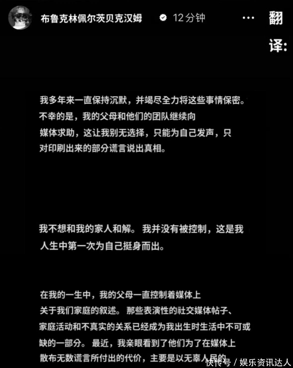 布鲁克林在文中毫不客气的表示多年来自己一直保持沉默,并试图将这些事情保密,然而父母持续通过媒体向自己施压,在忍无可忍的情况下,只能说出真相,并直言“不想和我的家人和解”。